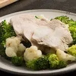 Slice the chicken breast and serve with the cauliflower, broccoli, and dipping sauce.