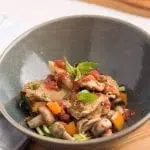 Right before serving, remove the bay leaf, stir in the zucchini noodles and basil, and mix thoroughly to combine.