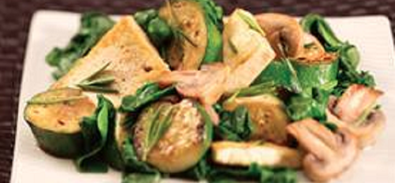 Cut zucchini into small chunks. Place all ingredients in a large re-sealable plastic bag. Let ingredients marinate for at least one hour. Flip bag over every 15 minutes to help evenly coat vegetables and tofu. Heat a skillet over medium heat. Remove tofu from bag, place in a bowl, and set aside. Pour the rest of the ingredients into skillet. Sauté vegetables until tender (8-10 minutes), then add tofu to skillet. Cook tofu until heated through and lightly browned (2-3 minutes). Remove skillet from heat and serve.