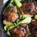- Remove chicken from pot and put on serving dish. Place bok choy in the pot with the juice and cover for 5 min. Pour bock choy and sauce over chicken. Top with sesame seeds.