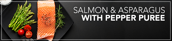 Prep time: 20 minutes Cook time: 25 minutes Yield: 1 serving Ingredients 6 oz raw salmon (yields 5 oz when cooked) 1 cup fresh asparagus ¼ cup red bell peppers, diced ¼ cup raw tomatoes, diced 1/8 tsp salt ½ cup water 2 Tbsp red wine vinegar 10 sprays non-stick cooking spray ¼ tsp pepper Directions 1. Preheat oven to 350° F. 2. Dice tomatoes and peppers; place on a cookie sheet and lightly spray with non-stick cooking spray. 3. Lightly season both sides of the salmon with salt and pepper. Place salmon in a baking pan and add water. 4. Bake salmon and vegetables for about 20-25 minutes. 5. Boil water for asparagus. As it heats, clean and trim asparagus ends. Leave as whole stalks or cut in half. Place in boiling water and cook about ten minutes or until tender-crisp. 6. After removing peppers and tomatoes from oven, let cool two to three minutes. Place in a blender, add vinegar and blend until the consistency of applesauce. 7. Arrange asparagus on a plate with salmon on top. Drizzle puree over salmon. Add salt and pepper to taste. Per serving: 400 calories | 16g fat | 12g carbohydrates | 46g protein |