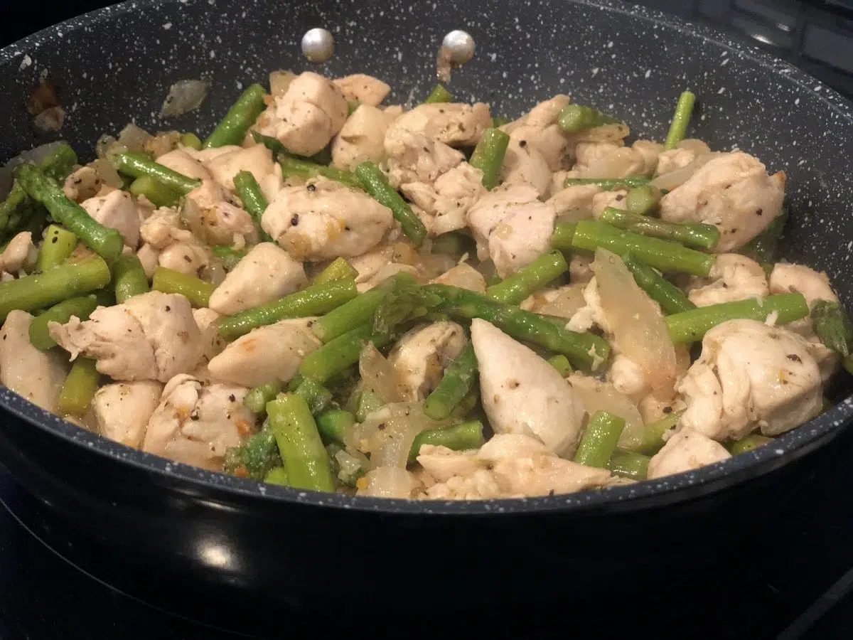 Cook the chicken for an additional 5-7 minutes, until almost all the pink is gone, then add the asparagus.
