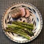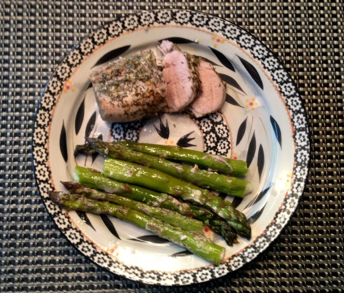 This is a very tasty, and easy to make pork roast. Plan to marinate for at least 45 minutes. You’ll get a tender roast and perfectly cooked asparagus.