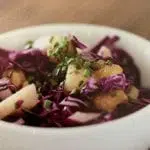 - During this time, cut the pineapple into small squares. Add to the bowl with the red cabbage.