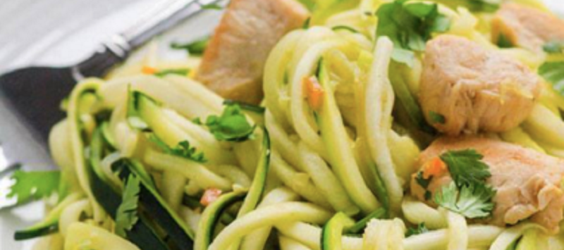 Using a spiralizer or mandoline, make zucchini noodles. Transfer into a large bowl and set aside. You can also chop zucchini into any size pieces if you don’t have the gadgets for making zucchini noodles. Preheat a large ceramic non-stick skillet on high heat and add chicken (you can also use non-stick spray in your skillet). Sauté until golden brown, stirring occasionally. Add cumin, ½ teaspoon salt and ground black pepper towards the end. Stir and cook for another minute. Transfer to a bowl and set aside. Wipe clean (or wash and pat dry) the skillet and return to the stove on high heat. Spray with cooking spray and add zucchini noodles. Sauté for 1.5 minutes, stirring frequently. Remove from heat and add previously cooked chicken, remaining salt, small hot peppers/jalapeños, lime juice, and cilantro. Stir gently and serve hot. Makes 3 servings. Per serving: